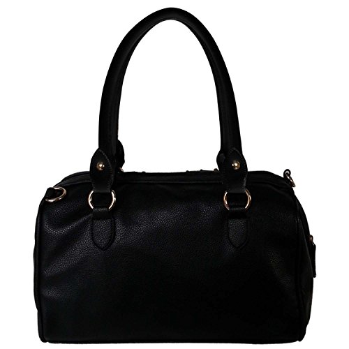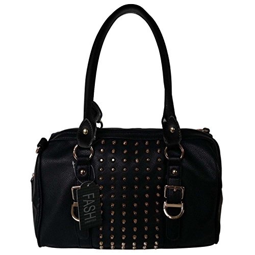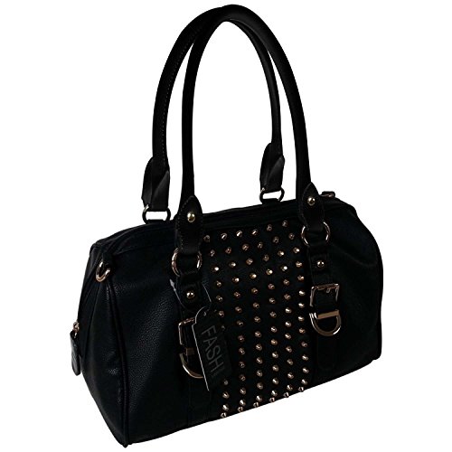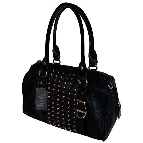 A perfect blend of sweet and edgy, this bag is a combination of all that a woman looks for in gorgeous handbag and a "MUST HAVE" this season. Thanks to this glamorous gold-tone studs that adorn this lovely barrel satchel, you can have classic shape and some edgy flair all at once. This gorgeous and versatile fashion handbag fits in fabulously with just about any look. Add some uniqueness to your attire, pair it up with this stunningly beautiful handbag and you are good to go. Apart from its dual adjustable faux leather handles, you also get 1 additional attachable cross-body belt which can be adjusted as per your convenience. With its total head turner appearance, this Classic Gold Rhinestone Studded Bowling Style Barrel Handbag by FASH is the perfect blend of cutting-edge modern fashion and timeless glamour and its time you add this new member to your wardrobe and make it look as glamorous as this beautiful handbag.Get home this Classic Gold Rhinestone Studded Bowling Style Barrel Handbag by FASH at an unbelievable price. Scroll above to know more about the offers we have for you
