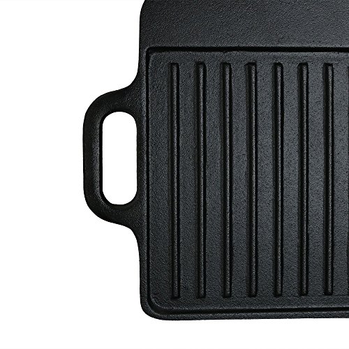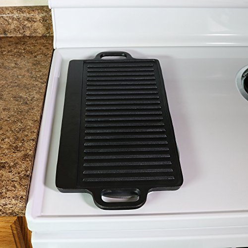 - Pre-seasoned cast iron 20" grill/griddle ready to use to cook mealsWhether you're looking for a cooking tool to take camping or a durable surface to help heat your food from home, this Sunnydaze Cast Iron Grill/Griddle, Pre-seasoned, 20-Inch is capable of cooking multiple tasty foods at once. This griddle is pre-seasoned so you're ready to sizzle up that bacon and get those veggies steaming right after you open the box. The reversible feature gives you the option to use the smooth side for cooking pancakes, eggs, or sandwiches while the grooved grill side can be used for hamburgers or steaks. Plus, cooking your food in a iron cast griddle can increase iron content in your diet.