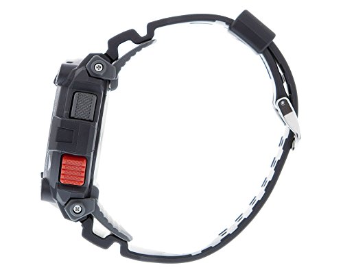 This Casio watch has a black resin strap and a stainless steel case with a grey dial. This watch also has many additional features including an alarm and a back light.