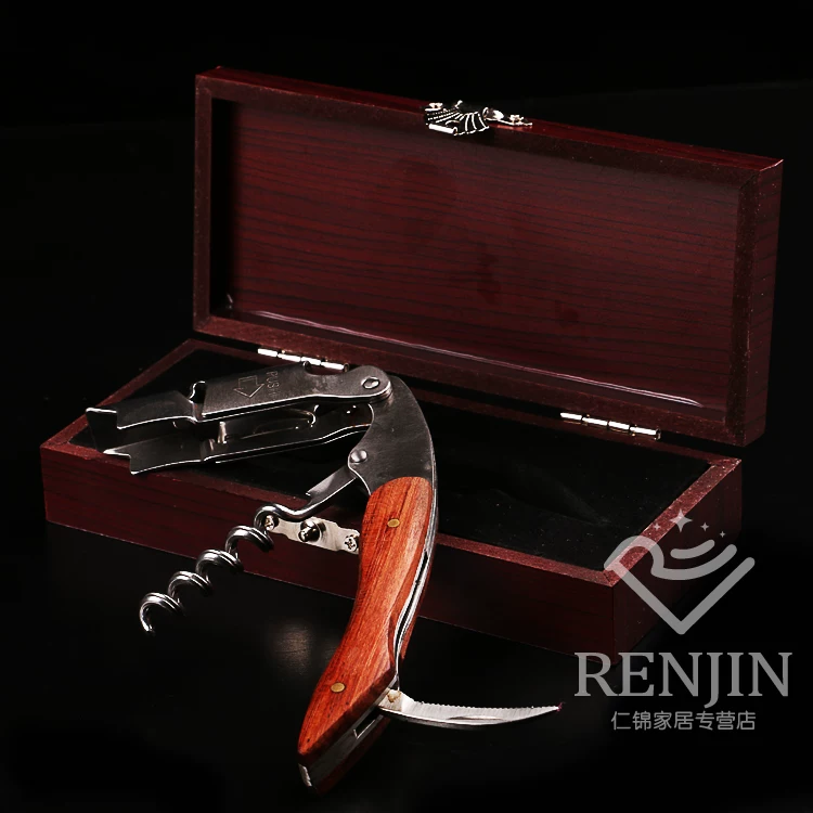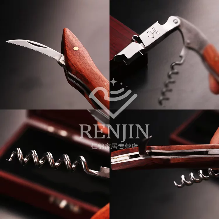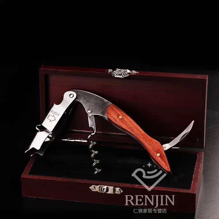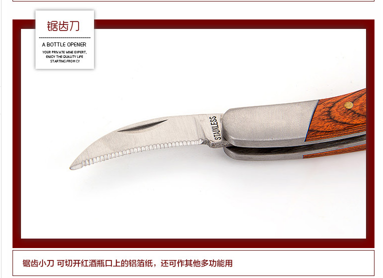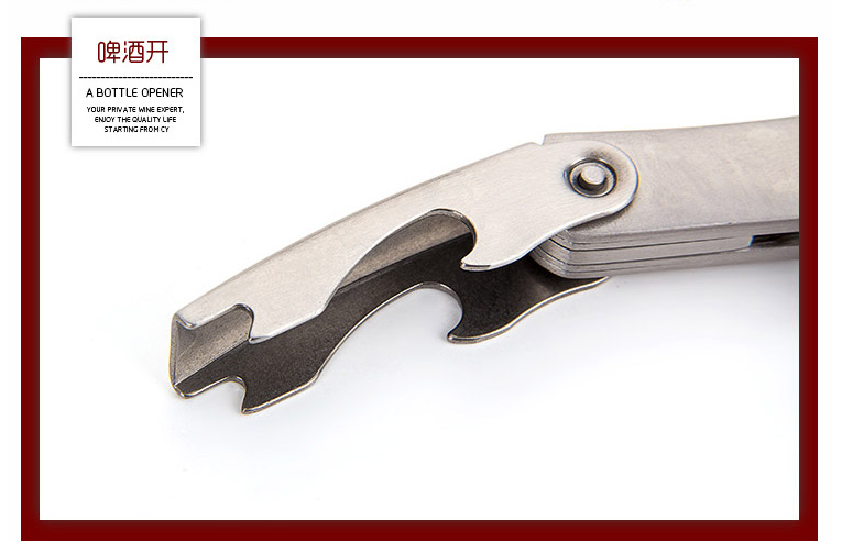 特点】:精钢制作,工艺精湛,木柄材质镶嵌把柄,更高档,功能多,可以开啤酒、红酒、香槟酒等各类酒种。出口品质,值得信赖。