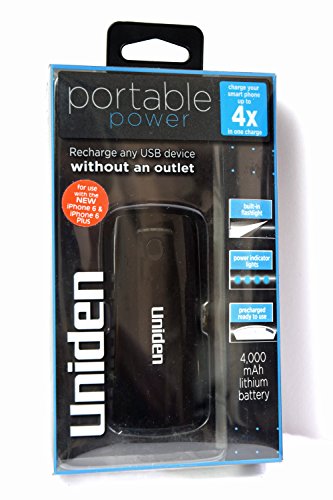 -. Binding : Electronics -. Brand : Uniden -. Color : Black -. EAN : 0680988983535 -. Feature : 4000 mAh Compact lithium ion battery / Charges Android, Apple and other smartphones up to 4 times or 24 hours of talk time / Convenient LED light / Included micro USB cable for recharging / Single USB output port -. Label : Uniden -. Manufacturer : Uniden -. PackageQuantity : 1 -. ProductGroup : Wireless -. ProductTypeName : ACCESSORY_OR_PART_OR_SUPPLY -. Publisher : Uniden -. Studio : Uniden -. Title : Uniden® Portable USB Phone Charging Battery Pack Bank Charger With Built-in Flashlight -. UPC : 680988983535