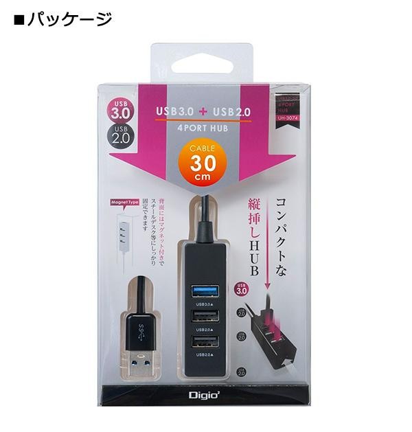 コンパクトな縦挿し4ポートハブです。底面マグネット付きでスチールデスク等に固定できます。4ポートのうち1ポートが「USB3.0」、3ポートが「USB2.0」対応となっています。 |