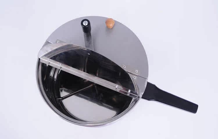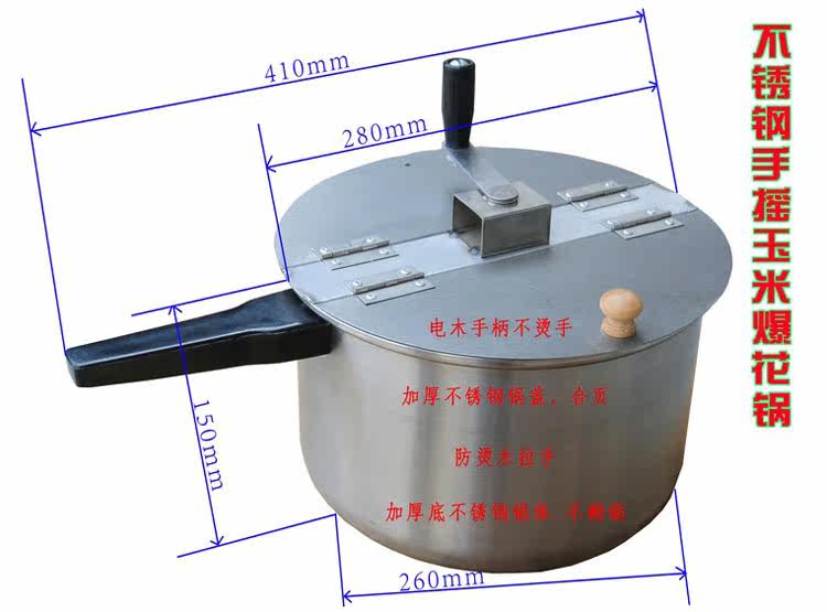 该锅采用高压锅做锅体,锅体壁厚达4mm,克服了薄锅在在搅拌不均匀时易糊焦的严重弊病。一个高压锅体可以连续使用5至10年不会坏,不锈钢弹性搅拌器,单开门,拉手式龙门支架,手提十分方便,新颖实用。坚固不变形。专业胶木手柄,下方胶木大手柄采用双螺丝固定,长期使用不会螺丝松动。随机赠送爆米花制作视频资料,和果味奶油的配方。注意视频是网络传送。