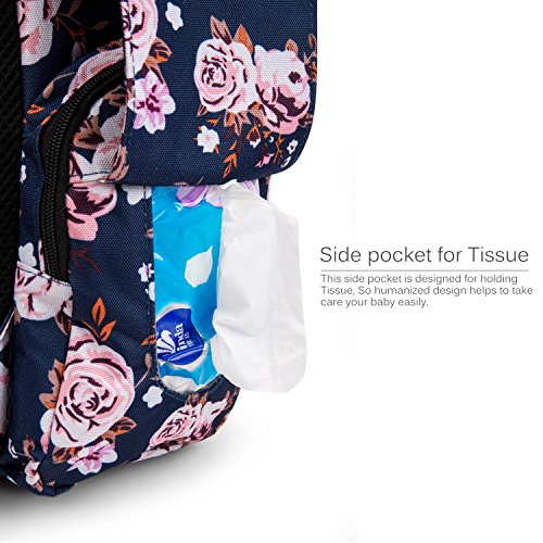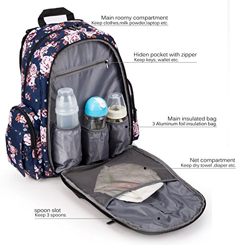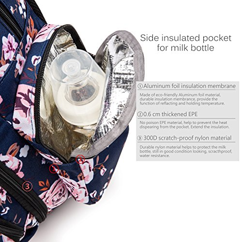 Include a side tissue pocket, a side insulated Pockets. Two front waterproof pockets for diaper. In the bottle compartment, include three insulated Milk bottle pockets; A net compartment for towel; A hidden pocket with zipper for keys. The main compartment for baby's clothes, shoes, etc.