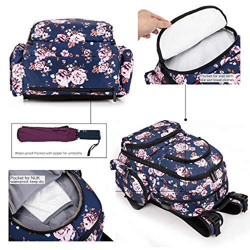 Lots of functional pockets. Include a side tissue pocket, a side insulated Pockets. Two front waterproof pockets for diaper. In the bottle compartment, include three insulated Milk bottle pockets; A net compartment for towel.; A hidden pocket with zipper for keys. The main compartment for baby's clothes, shoes, etc.