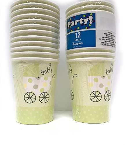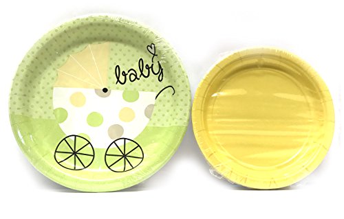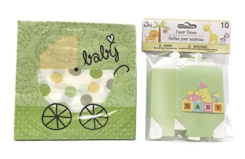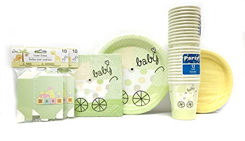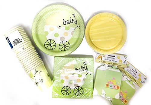 -. Feature : Any time of year light green and yellow either sex baby shower themed party pack. / Perfect for when the gender of baby has not been announced. Very versatile. / Contains 18 - 9" plates, 20 - matching napkins, 24 - 9 oz. hot cold matching drinking cups / 20 Matching Favor Boxes with Satin ribbons to fill with candy, nuts, favors. / Everything disposable.- Makes baby showers cute and easy.