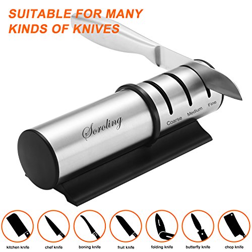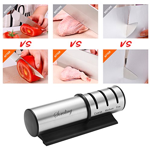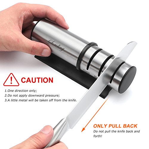 3 in 1 sharpening system designManual 3-stage design with coarse, medium and fine sharpening slots. With your knife sharpened the cut should be almost as good as when it was new.