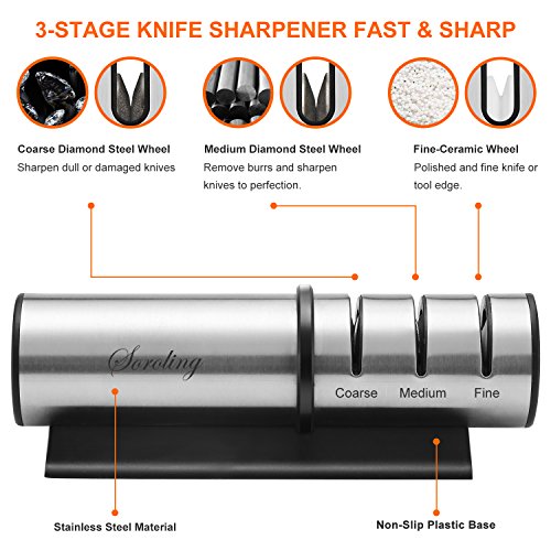 3-STAGE SHARPENING SYSTEM: Base on the condition of the knives, there will be 3 stage sharpening wheel, sharpen dull knives quickly and polish the blades to a razor-sharp edge.