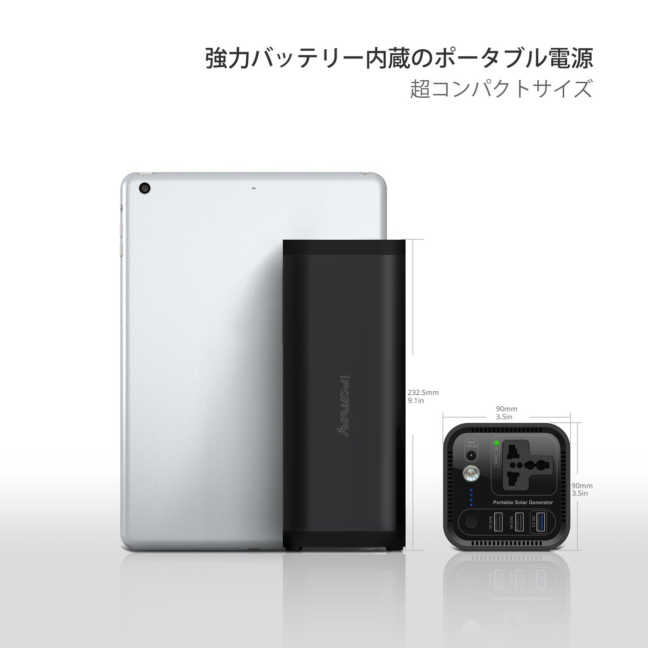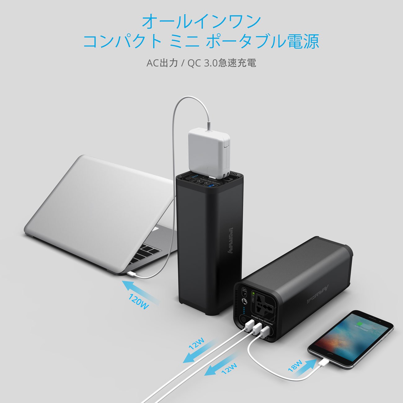Portable power supply can supply power to a wide range of appliances, home appliances, personal computers, smartphones etc. through AC outlet · USB port of 2.4 A · QC 3.0 rapid charging port.