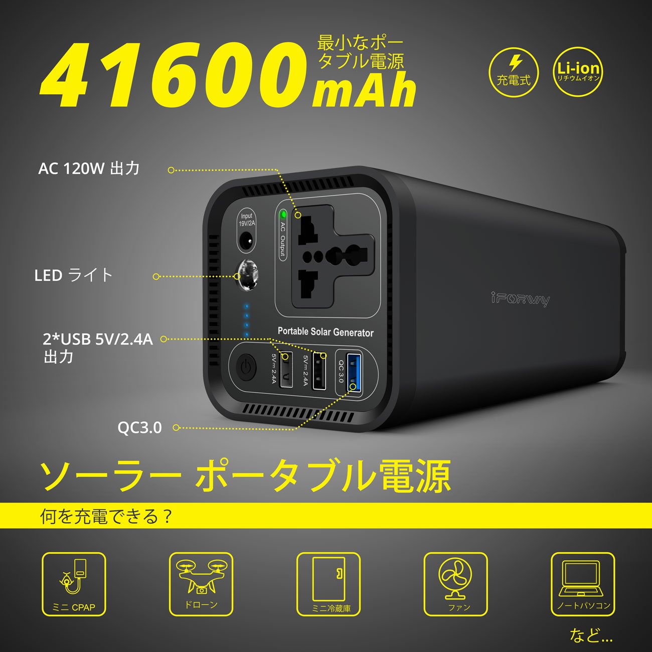 Outdoor camps, in-car nights, traveling and other smartphones and tablets, cameras, CPAP, telescopes, drone, laptop computers, etc. can be charged and have various uses.