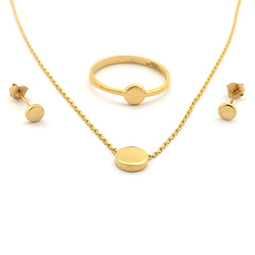 -. Feature : This set comes with earrings, necklace and a ring. Everything in the set is made of solid 14k yellow gold. / On the earrings: the diameter of the circle is 5mm, the chain is 17 inches long, the width of the chain is 1mm, the weight of the necklace is 1.7g. / On the necklace: the diameter of the circle is 7mm, the chain is 16 inches long, the width of the chain is 1mm, the weight of the necklace is 1.8g. / On the ring: the diameter of the circle is 5mm, the width of the band is 1.75mm, the thickness of the band is 1mm and the weight of the ring is 1.1g. The set comes with a size 7 ring, but feel free to contact us if you would like a different size. / Comes with a gift box and free shipping.