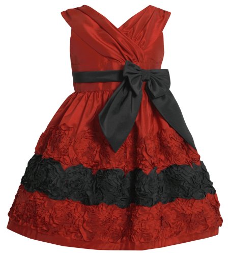 -. Binding : Apparel -. Brand : Bonnie Jean -. Color : Red -. Department : girls -. Feature : Sleeveless bodice; draped cross-over V-neckline; contrast black band & side bow trim at waist; hidden back zip closure; bow tie sash in back / Lined, knee-length taffeta skirt; contrast red-black-red bonaz rosette border hem; attached slip with ruffled crinoline underskirt / Machine wash. Imported (Philippines). / Matching/Coordinating sister styles available in sizes 4-16, reference style BNJ-11333X. / Needed size not available/sold-out? Find similar styles, search for: bnj-special-occasion-dresses -. ProductGroup : Apparel -. ProductTypeName : DRESS -. Title : Bonnie Jean Girls 2T-6X Red Black Cross Over Bonaz Rosette Border Taffeta Dress