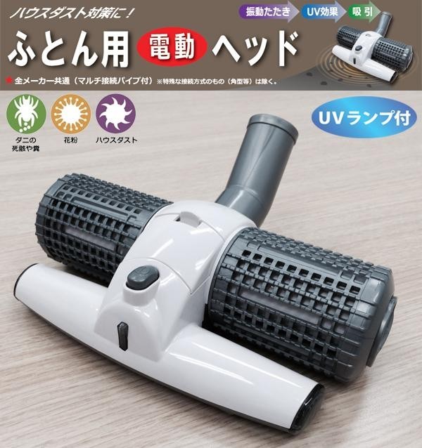 | 振動・UV・吸引のトリプル効果。振動でハウスダストを叩き出し、3ヶ所の吸い込み口が逃さず吸引、UV殺菌を行います。ダニ、花粉、菌などのハウスダストを強力除去。掃除機ヘッドを取り換えるだけなので、使い方は従来の掃除機がけと一緒です。専用のアタッチメントは、標準的な掃除機(内径32~39.5mm正円形)に対応しています。 |