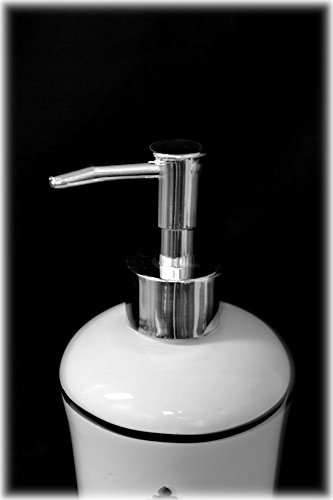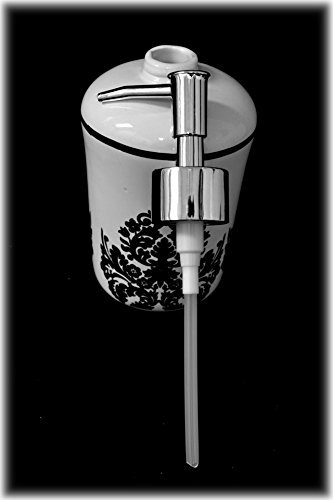 -. Feature : 4 Piece Ceramic Bathroom Set / Black and White Damask Pattern / Includes: Cup, Toothbrush Holder, Soap Dish, and Lotion Pump / Pump has Chrome Plated Plastic Pump / Approximate Dimensions: Cup: 4"Hx3" W, Toothbrush Holder: 4"H x 3"W, Soap Dish: 5" L x 3.5" W, 1" H, Lotion Pump: 7.25" H x 3" W.