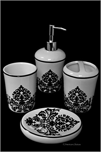 -. Title : 4 Piece Black & White Ceramic Damask Bathroom Accessory Set