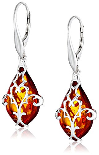 RHODIUM PLATED STERLING SILVER HONEY AMBER ORNAMENTAL DROP EARRINGS