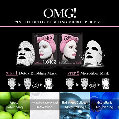 OMG! 2IN1 KIT DETOX BUBBLING MICROFIBER MASK is an effective deep cleansing skin care system as skincare begins with the essential cleansing. Small carbonated bubbles stimulate and cleanse skin by removing all traces of oil, sebum, and dead skin. STEP 1 - Detox Bubbling Mask Detox Bubbling Mask will cleanse and detoxify the face with natural ingredients. STEP 2 - Microfiber Mask Microfiber Mask will feed the skin with various nutrients, hydrolyzed collagen and plant-based stem cells to give your skin a healthier, younger looking glow.Feature