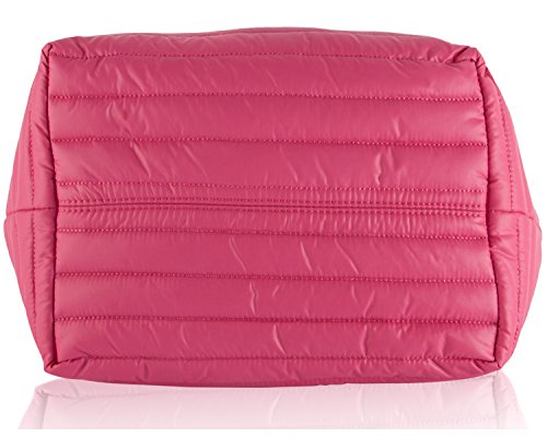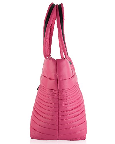 Travel light with this lightweight and spacious Steve Madden Brova Tote. Horizontal quilted nylon contstruction, front logo plaque and zip pocket. Zipper closure opens to fully lined interior with zip and slip pocket.