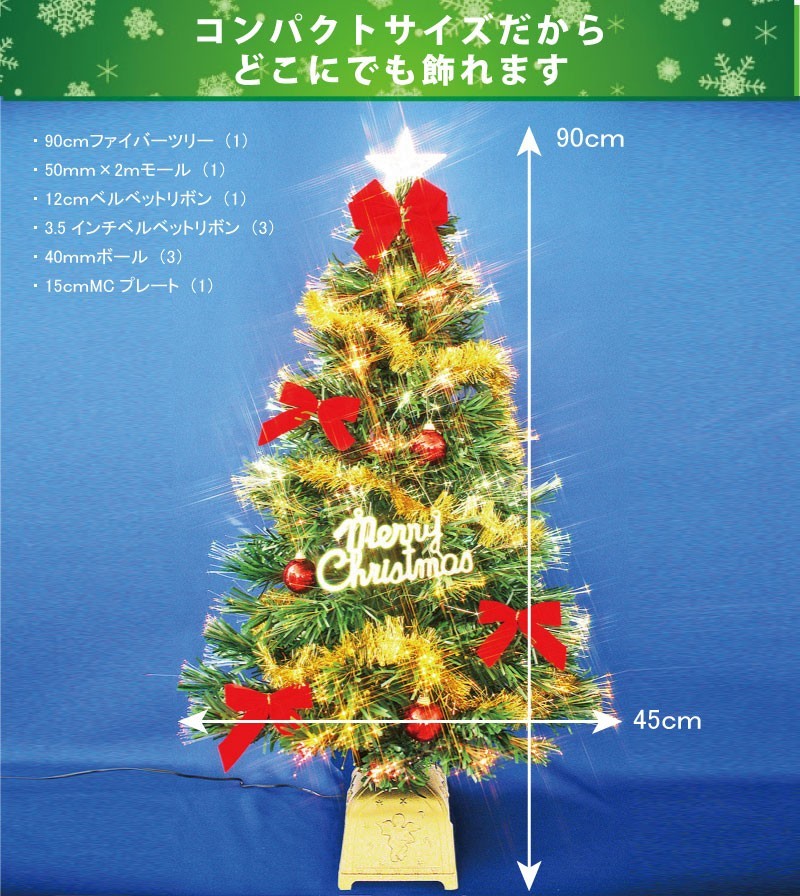 クリスマスツリー 一つ一つの枝からファイバーの幻想的な光が輝くツリーセットです。箱から出して、枝を広げ同梱のオーナメントを飾りつければクリスマスムード満点です。扱いやすい90cmのファイバーツリーをご奉仕価格でご提供致します。早い者勝ち!サイズ 直径45cm×高さ90cm 外箱  18×27×66cm 1個口 (セット明細)・90cmファイバーツリー(1)・50mm×2mモール(1)・12cmベルベットリボン(1)・3.5インチベルベットリボン(3)・40mmボール(3)・15cmMCプレート(1)