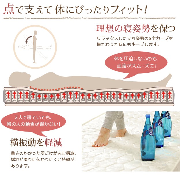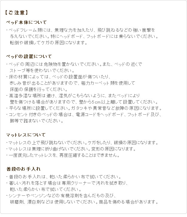 材質:ベッド本体-プリント紙化粧パーティクルボード(木目柄)、ベッド本体内側補強板-パーティクルボード、ベッドコンセント-2口合計1500W・コード長1.8m、マットレス張地-ポリエステル100%、マットレス中身-ウレタンフォーム・不織布・フェルト、マットレスコイル-ポケットコイルスプリング・コイル数450