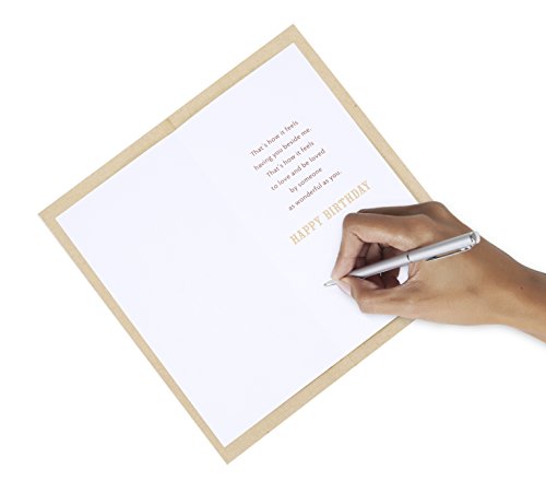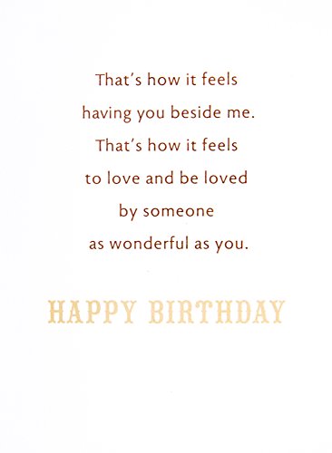 Celebrate your husband's birthday this year with this card featuring a wide leaf-patterned border near the fold in gold and tan hues. The message on the front of the card reads, "With You Beside Me When you've got someone beside you—someone strong, dependable, supportive, and giving—the hard times are easier, the easy times are sweeter, and the sweet times make you feel like the most loved person in the whole world." Open the card to reveal the inside message, "That's how it feels having you beside me. That's how it feels to love and be loved by someone as wonderful as you. Happy Birthday " The card measures 8.3 inches long by 4.5 inches wide made with high quality cardstock paper; an envelope is included. All Hallmark cards are made with paper from well-managed forests. Hallmark was founded in 1910 when 18-year-old J.C. Hall arrived in Kansas City, Missouri, with a couple of shoeboxes of postcards under his arm and the American dream in his heart. Hallmark greeting cards are sold online and in nearly 40,000 retail stores across the globe and people continue to recognize the iconic Hallmark brand as "the very best."Feature