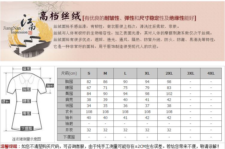 尺碼表僅做參考,尤其旗袍較為特殊。所有尺寸均為平鋪測量,建議選擇比自己淨三圍略大的碼數。商品均為手動測量,尺寸誤差2.0 CM左右均為正常現象。