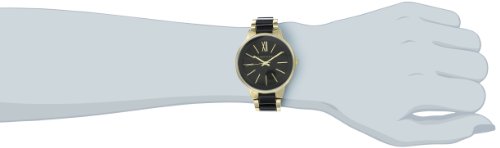 The luxe combination of black and gold creates a must-own watch from Anne Klein. Gold-tone mixed metal bracelet with black center links Round case, 37mm Black dial with gold-tone Roman numerals, stick indices, two hands, sweep second hand and logo Quartz movement Limited lifetime warrantyFeature