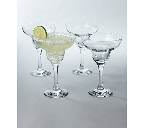 Product Description Exclusively ours! Everyday glassware holds 10 ounces of your favorite margarita concoction. Set of four margarita glasses are crafted with quality construction in a modern design. Dishwasher safe. Imported. 0