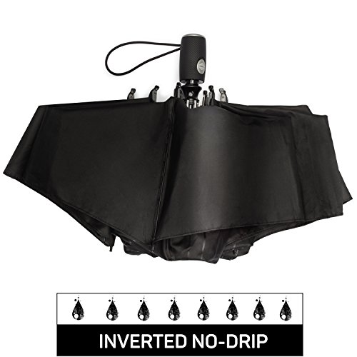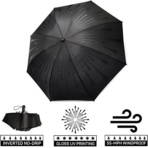 -. Feature : REVOLUTIONARY INVERTED / REVERSE DESIGN - This allows the umbrella to close AWAY from you, preventing water from dripping on you when closing the umbrella. This revolutionary design development keeps you absolutely dry, avoiding the slight shower you get when you close regular umbrellas. / SUBTLE DESIGNER PRINT - Black is trendy, but every other umbrella is a plain black. That's not our style. We worked with an award winning designer to create a subtle clear raindrop print utilizing a unique UV Spot Gloss printing method to create a high-end, classy designer look. / COMMERCIAL GRADE STRENGTH - With oversized ribs constructed out of high-strength aluminum, this umbrella is rated for wind speeds of up to 60 MPH while staying light and easy to carry. / BEST BUILD QUALITY - In the age of cheaply made products, we wanted to build a product that will last years, not weeks. We tested products from many of the largest umbrella manufacturers, and picked the one with the best attention to detail. We also specified the best materials to create a superior umbrella. / DESIGNED IN & SHIPS FROM THE USA - Our team of engineers and designers started with a blank canvas and reimagined what we would want an umbrella to look like and the features it should have. Over numerous iterations, we distilled the design and specifications to create something that we are proud to use ourselves. Let it rain.