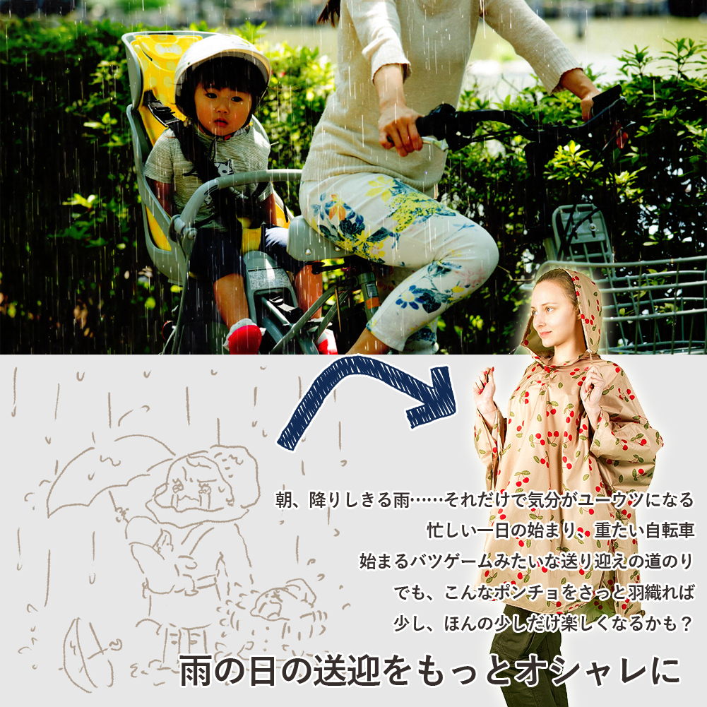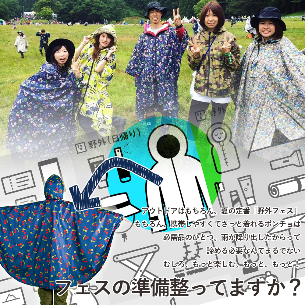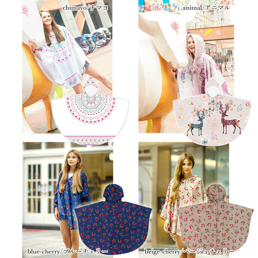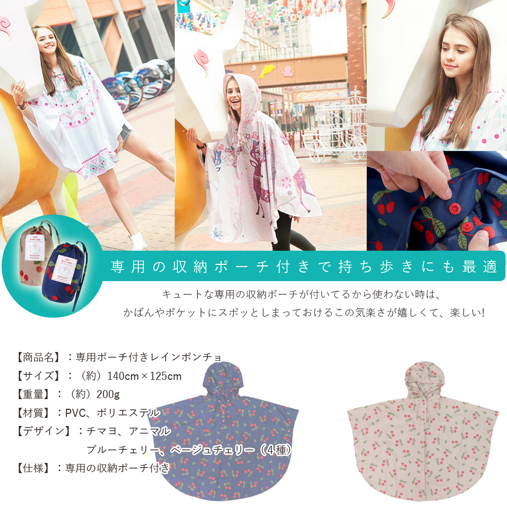 商品コード:brq0116商品名:専用ポーチ付きレインポンチョサイズ:(約)140cm×125cm素材:PVC、ポリエステルデザイン:チマヨ/アニマル/ブルーチェリー/ベージュチェリー仕様:専用収納ポーチ付属◆今、流行りの可愛いポンチョ◆憂鬱になりがちな雨の日でも、可愛いポンチョを羽織ればきっと楽しくなれます♪◆傘だとお隣さんの邪魔になりがちな野外フェスのマストアイテムです
