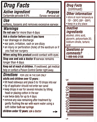 Product DescriptionSize 0.5 oz per bottle. Ear Drops Earwax Removal Aid Carbamide Peroxide 6.5% .0