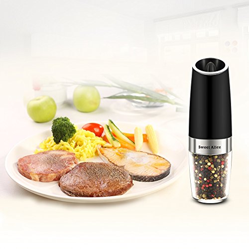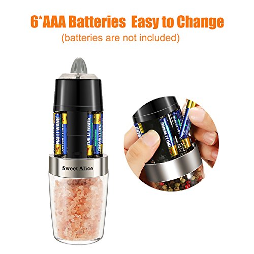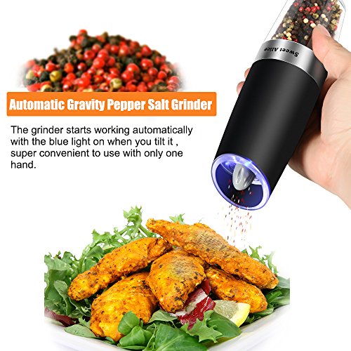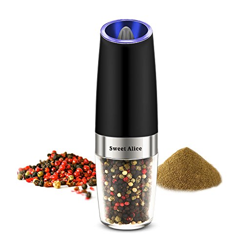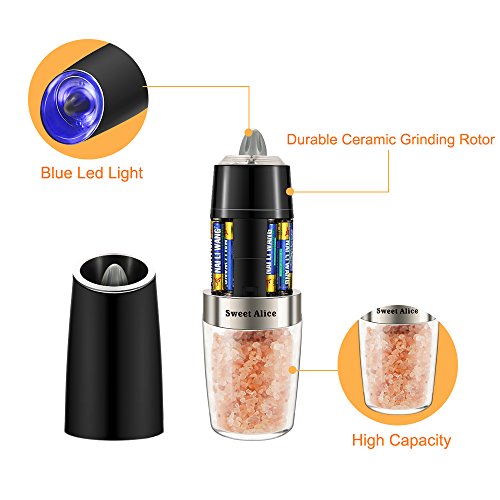 Automatic Gravity Salt Pepper Grinder, Portable Electric Salt Mill with Adjustable Grinding Coarseness ,Battery Powered Salt Pepper Mill with Blue LED Light, Stainless Steel ,Black