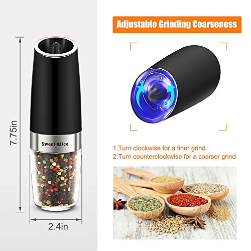 1.EASY TO USE: The mill adopts gravity sensing principle.It starts working automatically with the blue light on when you tilt it to a certain degree , no button to press, super convenient to use with only one hand.