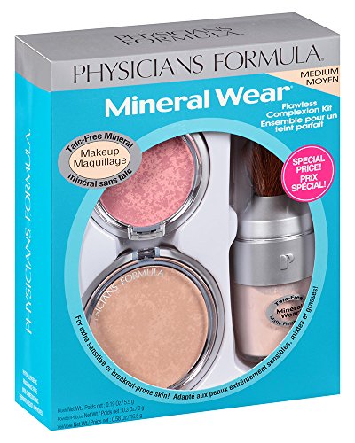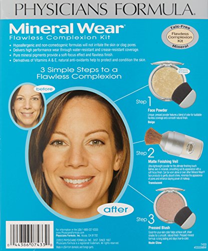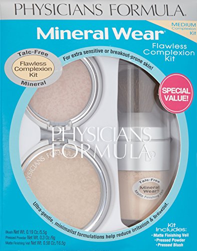 Physicians Formula mineral wear flawless complexion kit includes everything you need for minimal makeup while giving a fresh, flawless look to your skin. Kit includes: Matte finishing veil: Ultra-lightweight powder for the ultimate finishing touch to your makeup. Bathes skin in minerals, smoothing out its appearance with a soft focus finish. Pressed powder - spf 16: Minimalist talc-free formula specially developed for the most sensitive and/or breakout-prone skin. Gentle formula help to minimize the risk of irritation and breakout. Minerals help achieve a smooth "second skin" feel and finish. Pressed blush: Minimalist talc-free formula provides color that is good-for-your skin and helps achieve soft, sheer shades for a smooth, natural finish.Feature