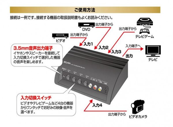 | 仕様 | 入力端子:4系統(映像・音声L/R) 出力端子:1系統(映像・音声L/R) 電源不要 |