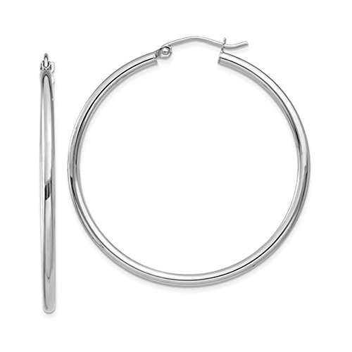 These hoops are 14k white gold. They are NOT plated, but have a pure gold body with a hollow interior. Every hoop comes with an authenticated 14k stamp.