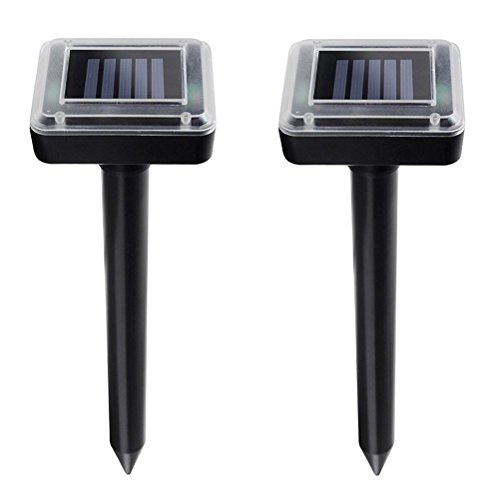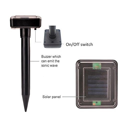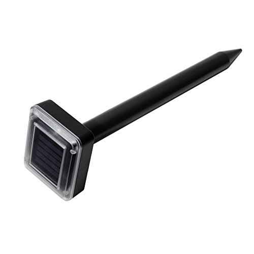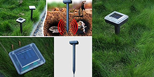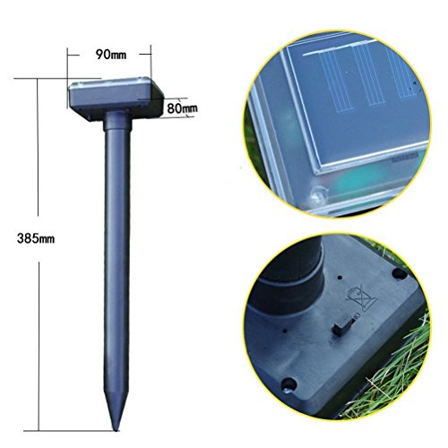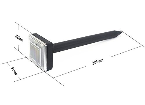 -. Feature : Keep moles, gophers, voles, badgers and mice away from your lawn, gardens and yards forever, an ideal pest control device for your garden / Chemical Free: No posion, no chemical, safe to your pets and human, easy and safe to use / Unique design and high quality, made of waterproof material, durable in use and easy installation, just plug the bar into the earth / Solar Powered: Use solar energy, eco-friendly, no extra batteries needed, when fully charged by sun, it can continuously work at day and night / By transmitting ultrasonic waves 4 seconds pulse at 40 seconds intervals, keep the mole gophers away within about 7,000 sq.ft, build a safer place for you and your family.