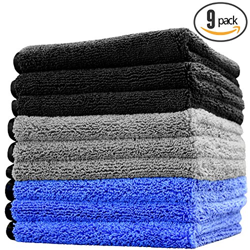 ULTRA PREMIUM 70/30 Blend 420gsm Tagless Professional Microfiber Towel With Over 360,000 Fibers Per Square Inch and Totally Paint-Safe Silky Soft Satin Border. Includes 3 Black, 3 Grey, & 3 Royal Blue Towels