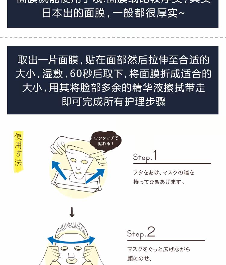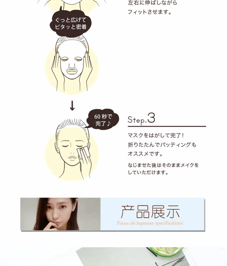 Open the lid and take out one mask sheet, apply it onto the face. Leave for 60 seconds then remove.