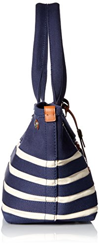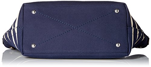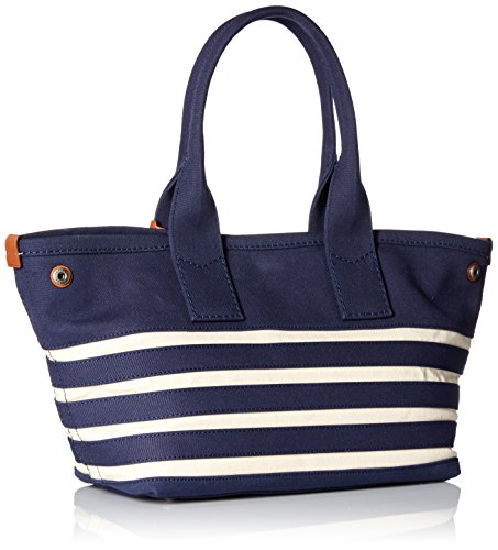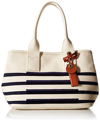 Striped tote bag with spacious interior and leather logo fob