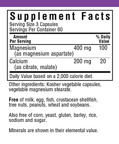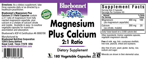 Bluebonnet's Magnesium Calcium 2:1 Ratio is used to improve bone support and reduce the risk of disease. Bluebonnet's Calcium Magnesium 2:1 provides a 2:1 ratio of magnesium from fully reacted magnesium aspartate, plus calcium in a chelate of calcium citrate and malate. Available in easy-to-swallow vegetable capsules for maximum assimilation and absorption,.Feature
