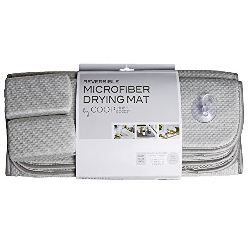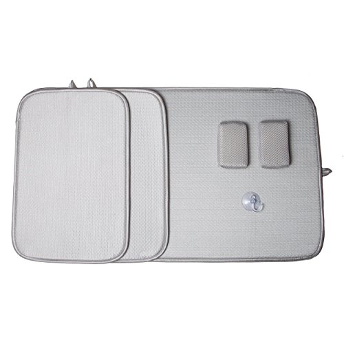 Coop Home Goods - Reversible Microfiber Dish Drying Mat - 3 Pack Set contains 1XL 18"x32" 1L 18"x16" 1M 18"x12" - 2 Free Microfiber Sponges and Bonus Suction Cup Storage Hook - Grey