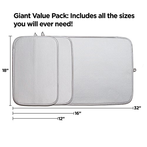 JUMBO VALUE SET - Best Value on Amazon- Reversible Foldable Microfiber Drying Mat Set includes a bundle of 3 different sizes to suit all your needs. XL Mat 32" x 18" Large Mat 16" x 18" Medium Mat 12" x 18". This includes a set of 2 bonus sponges and a suction cup hook FREE! - Perfect for drying the mat when not in use.