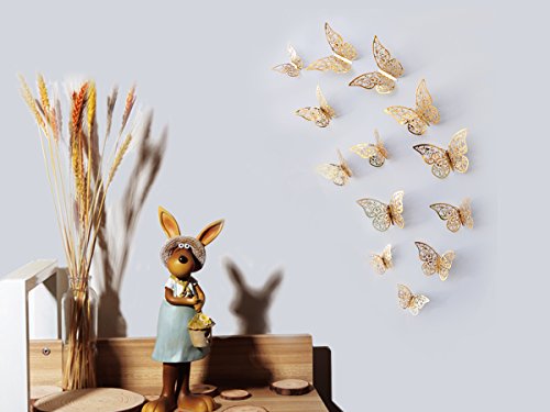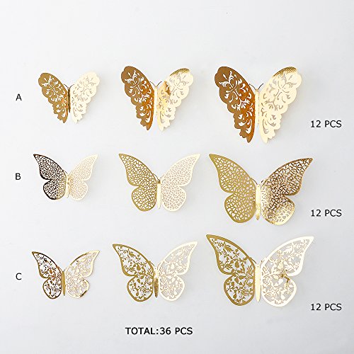 - SPECIAL DESIGN-Gold 3D butterfly decorations set include 36pcs(3 patterns:12A+12B+12C )unique hollow-out butterfly decals ,these wall decals make the wall decoration effect gorgeous ,elegant and glitter.
