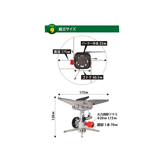 【 사이즈 재질 발열량 】●사용 사이즈:폭155mm×(길이)깊이155mm×높이127mm/수납 사이즈:폭82mm×(길이)깊이68mm×높이109mm/상품 중량:약360g/컬러:실버 ●재질:〔본체〕주물 알루미늄,〔버너 오덕각 방풍〕스테인레스 ●가스 소비량:약194g/h(기온20~25℃의 때10분간 가스 소비량을 1시간에 환산한 것) ●최대형 발동기정 열량:2.7kw(2,300kcal/h)/연속 연소 시간:〔이《와타니카셋토가스쥬니아》사용 시〕약40분(기온20~25℃의 때 화력이 센불에 연속 사용 했을 때의 기준 시간) ●점화 방식:압전점화 방식/용기착 탈방식:압입 반전 방식/수납 상자 크기:폭97mm×(길이)깊이85mm×높이127mm/수납상 중량:약430g/부속품:전용 하드 케이스,●패킹(안쪽 치수7mm×굵음2mm)