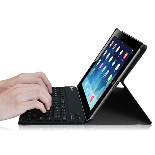 -. Feature : Specifically designed for Apple iPad with Retina Display, iPad 3 and iPad 2. Magnetically detachable ultra slim 7mm and light weight bluetooth keyboard with 10M range. / Ultra-slim design adds maximum protection with minimal bulk (0.38 in). Adjustable stand securely holds your iPad in landscape mode. / Durable PU leather cover and soft, microfiber-lined interior provide full protection for your tablet. Premium polycarbonate shell locks your tablet in place and absorbs drops and bumps. / Real hard laptop style keyboard with high end ABS material. Not cheap silicone keyboard as other cases in market. A sP.R.Ing mechanism underneath each key ensures a tactile response with every stroke, helping you to type faster and with less error than on / This product is sold exclusively by Fintie. Only buy from Fintie to get genuine Fintie(TM) products with manufacturer warranty and superb customer service. Package contents: Fintie Bluetooth Case and Keyboard, micro USB cable, instruction manual.