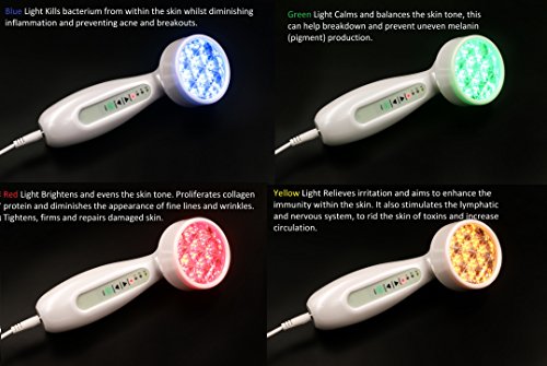 -. Feature : INCREDIBLE VALUE only LED light therapy that includes 4 Interchangeable heads with different wavelenghts for specific treatment including Anti-aging, Hyperpigmentation, Acne control, and Lymphatic Drainage. MSRP $149.99, Introductory Offer / LED Light Therapy is a pain-free, non-invasive, soothing and rejuvenating skin treatment. This treatment will help treat breakouts, fine lines and wrinkles, post inflammatory scarring and rosacea. It will not only help minimize breakouts , but also soothe your skin and reduce both redness and inflammation. / Heals blemishes, reduces skin degradation, helps improve sun damaged skin. Creates more skin moisture, increases circulation, leading to a healthier skin tone. / Powered by an exclusive nano LED technology that enables light to penetrate deep into the body's tissue for maximum effectiveness. / CLINICALLY PROVEN TO SEE RESULTS ONE YEAR WARRANTY AND 30 DAY MONEY BACK GUARANTEE