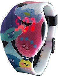 A wonderful LED digital watch has a large Trolls characters printed on the band that any child will love. This is similar to the rubber bracelets that have swept over the country but also has a watch feature. Press face for LED Light up Display, The rubber band that features a buckle closure will fit your child's wrist comfortably, Easy to read Digital Light Up time. Perfect for any Trolls Kids FanFeature