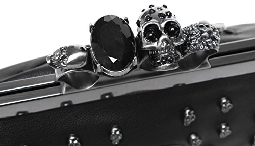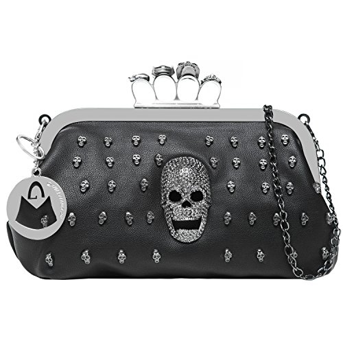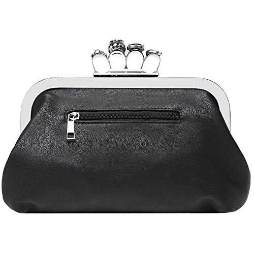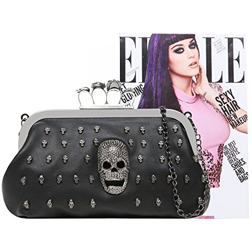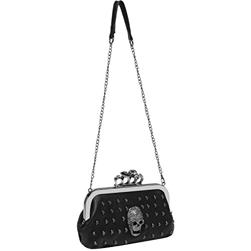 - Feature : Gothic knuckle duster clutch is a fashionable yet rock-n-roll style accessory. / Adorned with small gunmetal skulls and a 3D skull covered in same color stones. Includes 4 brass knuckle inspired clutch rings. / Fabric interior features 1 zippered pocket and 2 open pockets, perfect for storing your wallet, keys, cell phone and makeup. / **Official MG Collection® product by MyGift® features signature keychain charm.** / Approximate Dimensions: Exterior - 11.5" L X 3" W X 8.5" H. Interior - 8.5" L X 3" W X 5.5" H. Shoulder Strap - 17" drop.