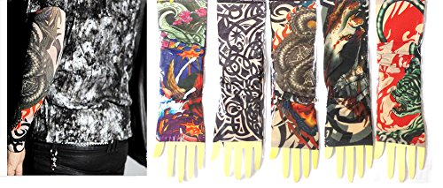 -. Feature : Unisex, stretchable, seamless, one size fits most. (except for really big arms) / They Look real! Measurement: 18 inches long x 4 inches wide (when not stretched) / Included popular patterns: tribal, skull, dragons, tigers, figures, and so on. / 10 (5 pair) different designs of tattoo sleeves as shown / Looks real. Easy slip on and off. Material: nylon + spandex.